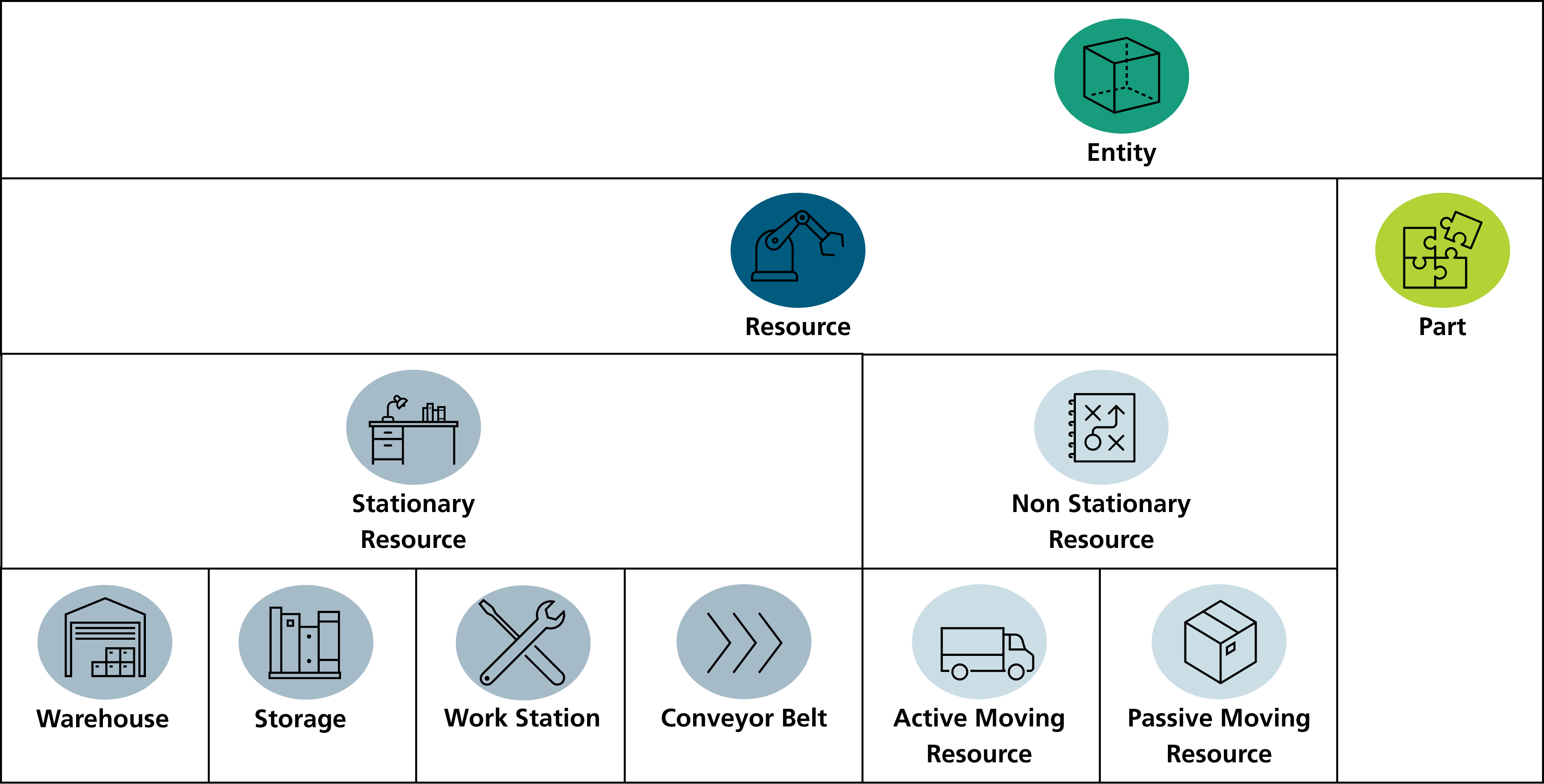Resources are used to transform or change entities (including parts as well as resources). Next to the situation in another resource that has all entities, resources have a physical body (with position, length and width). Additionally, to handle chronological execution of the processes on the resources, a process execution plan is used to plan the process executions.