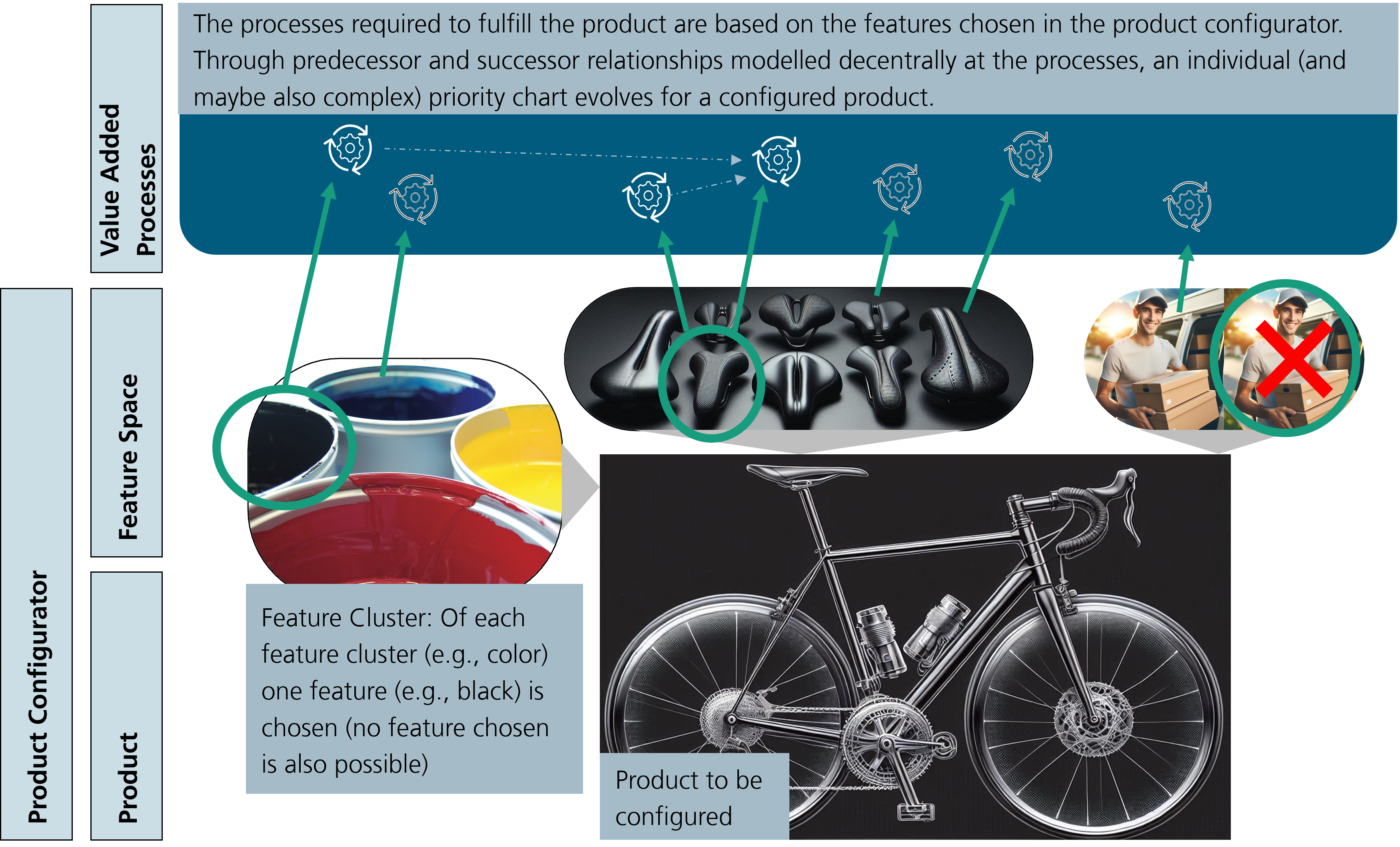 The order contains a pool of features that are chosen by a customer. Eventually, the feature pool specifies a product configuration that can be highly individual. E.g., a bicycle that consists of a sport frame, a disc brake and other features. If, for example, the disc brake is broken down further in a bill of materials, the feature can consist of several parts, which are processed in one or more processes. The logic is taken from complex product configuration systems as used in the automotive industry. The idea is that the feature pool of the (sales-) order is used as input for the work order that define the processes need to be executed.