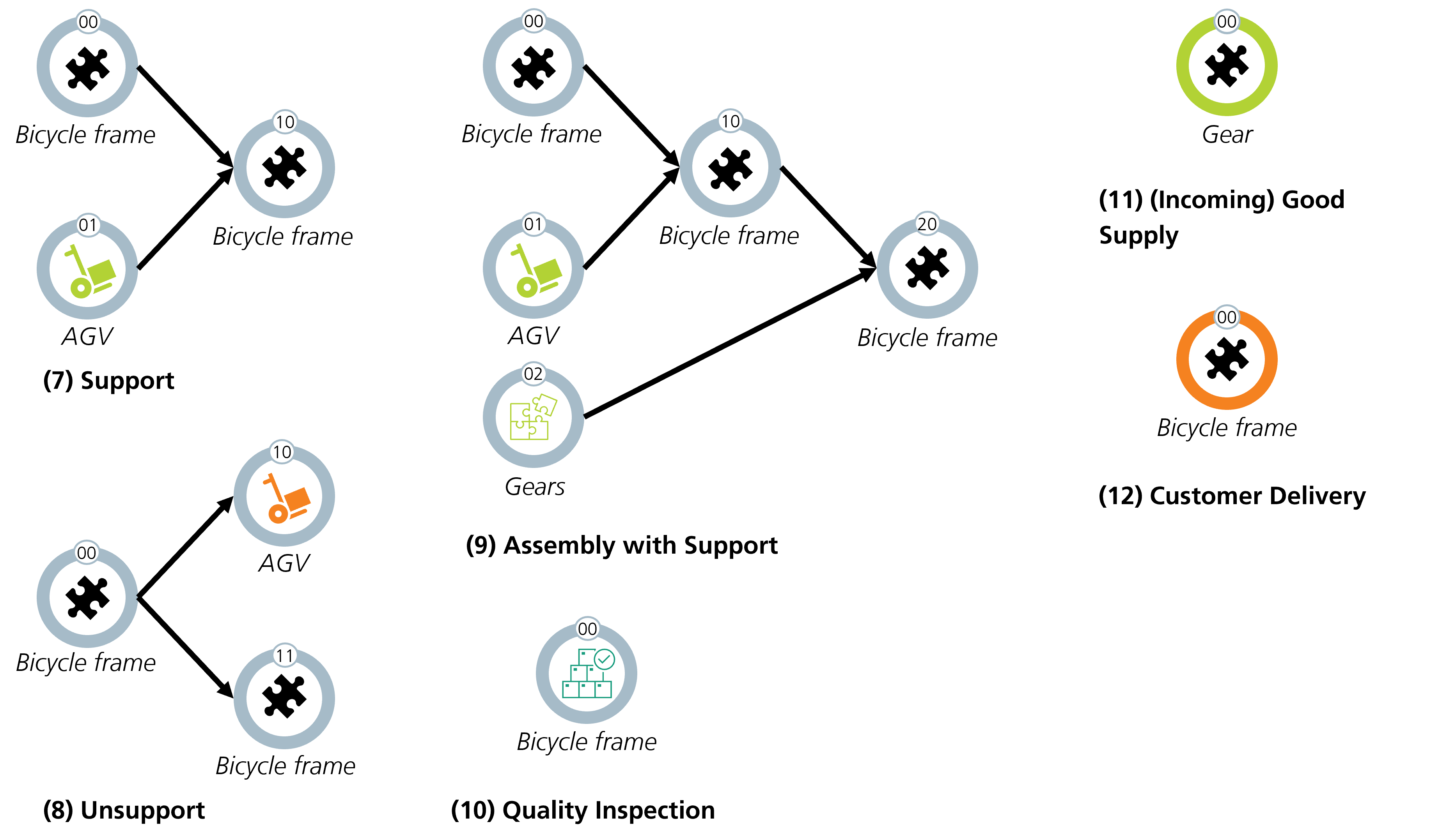 In the assembly, a subpart is added to the main entity. Additionally, to this transformation, the main part is supported before the assembly. Use Case: Required to describe the state that the carrier resource is used in the process. E.g., the AGV is required as a carrier within the assembly process and in combination with the bicycle. This means that it is not valid, that the bicycle frame is not on the AGV.
